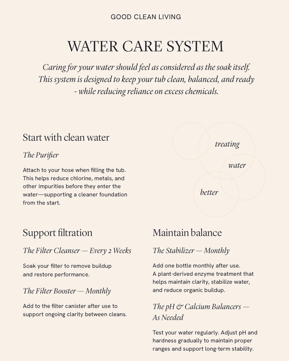 Good Clean Living is a preventative approach to water care that reduces chemical reliance at every stage - saving you time, water, and resources. Taking a more considered approach to water care, the complete water care system is designed to reduce chemical use, simplify maintenance, and extend the life of your hot tub water while elevating the soaking experience with cleaner water, fewer chemicals, and a softer, more natural soak.