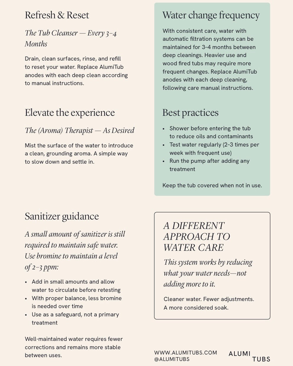 The 6 month water care system is a collection of premium, plant-derived and mineral based formulations carefully designed for a more natural way to soak, safe and effective to use in all hot tubs, jacuzzis, spas, soaking tubs and cold tubs for a ritual-led, low-chemical approach to water care.